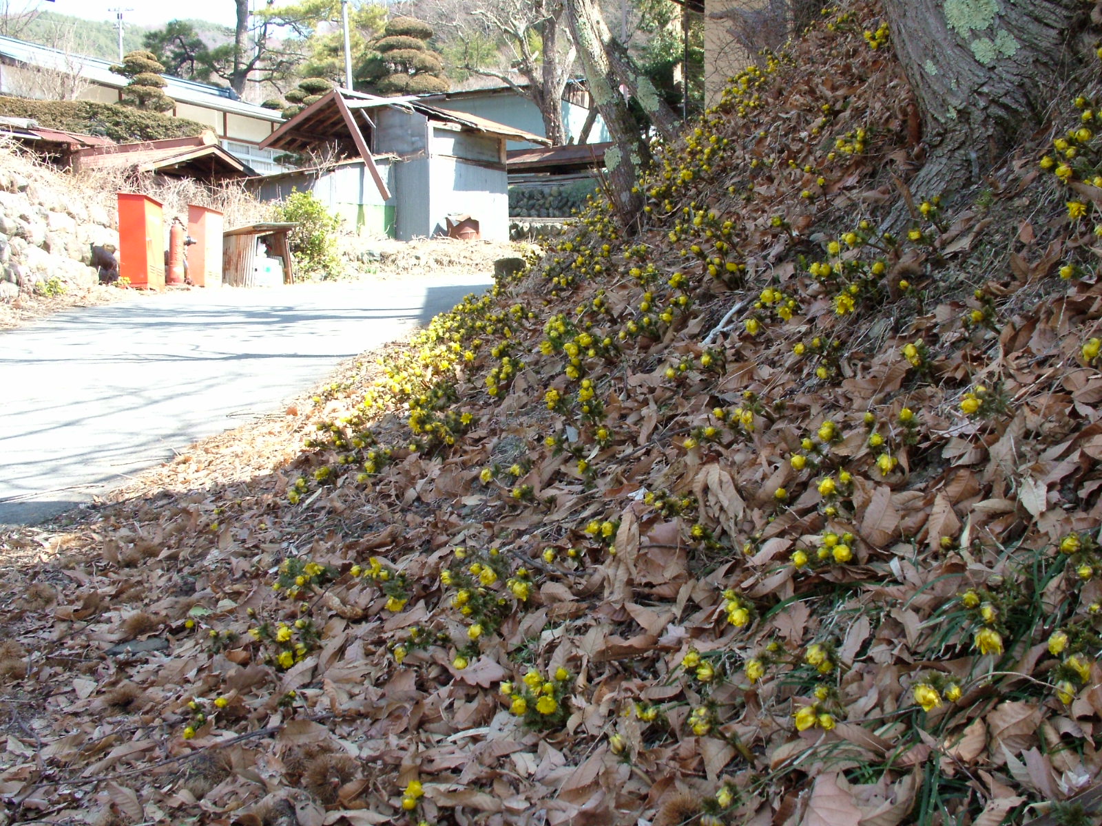 集落の路脇に咲く福寿草