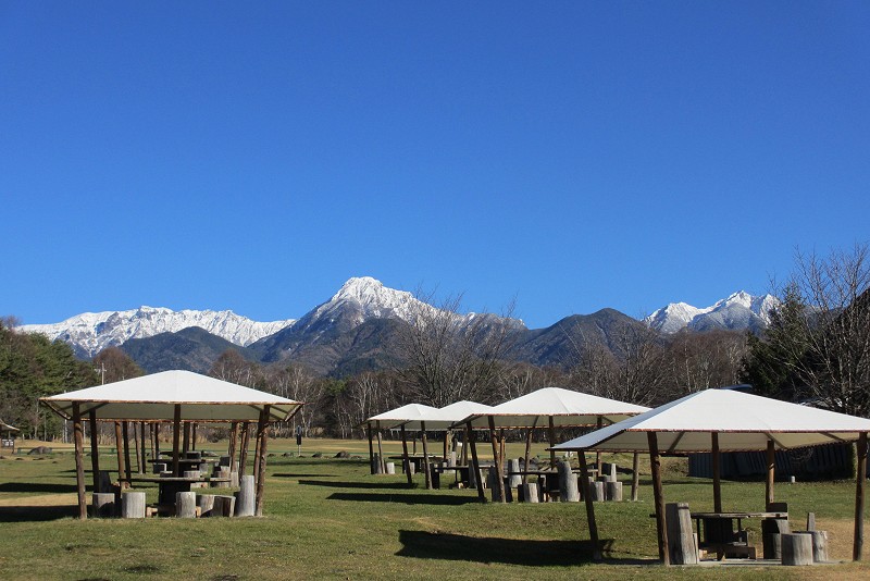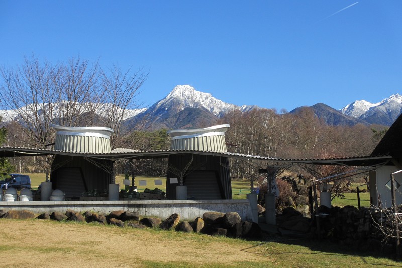 農場のバーベキューハウスと八ヶ岳