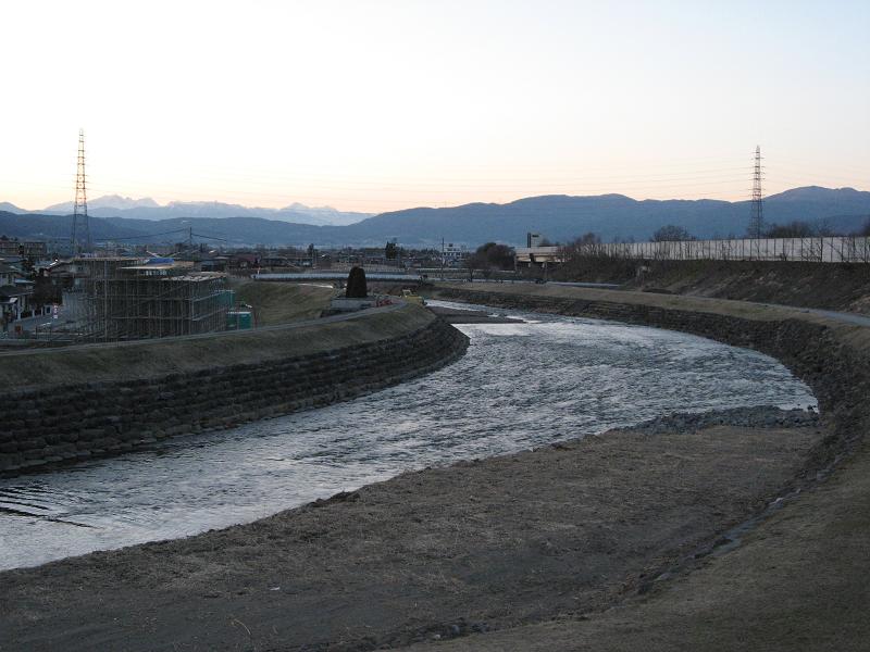 北アルプスの峰々が彼方に見える『宮川の川越し』