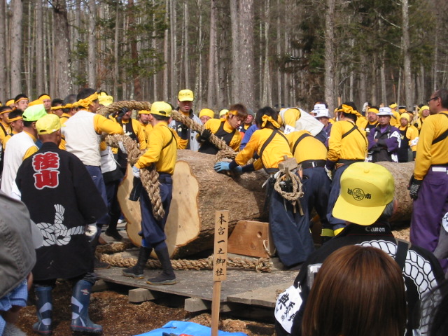 今日は本宮一の御柱が『木造り』をしていました。 今回、名誉ある本宮一の御柱を引き当てたのは、諏訪市湖南(こなみ)、中洲(なかす)地区です。 この地区のイメージカラーである山吹色のハイネックシャツに全員が身を包み、ラッパ隊の演奏に合わせて「ヨイサ、ヨイサ」の掛け声で、御柱に『輪なぐり』を付けていました。 この輪なぐりに曳き綱を付けますが、向かって右側が『男綱』、左側が『女綱』と呼ばれています。 写真ではわかりにくいと思いますが、この作業に集まった人の数はゆうに100人を超えています。 明日からは残りの御柱の木造りが始まり、いよいよ3日後に迫った山出しを迎えることになります。