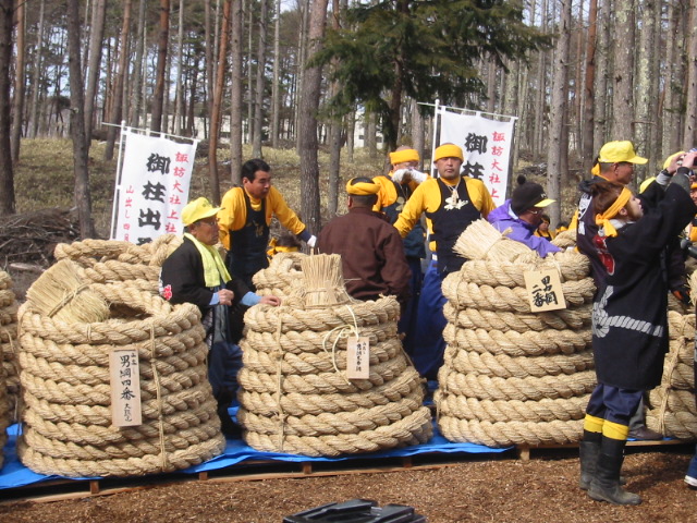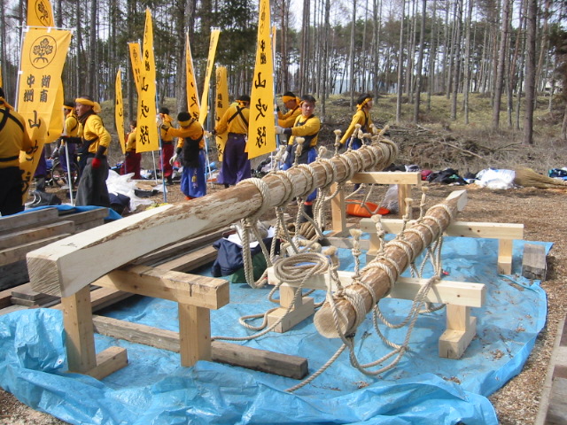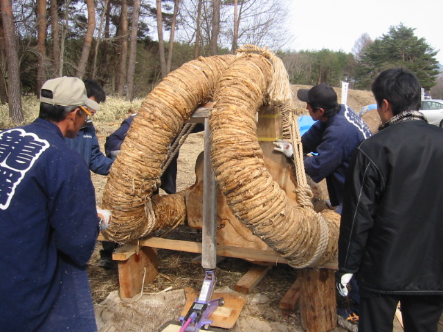 『輪なぐり』の完成(本宮三の御柱)、これに曳き綱(男綱・女綱)を付けます