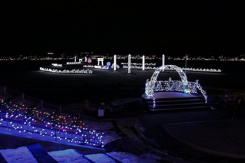 諏訪市湖畔公園の御柱イルミネーション。