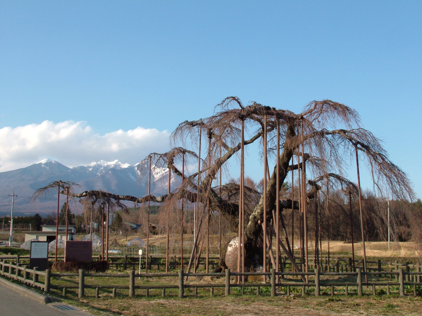 一気に雪解けが進みこのまま春! と思いきや3月下旬から冬に逆戻りしてしまい標高1,300m以上の四季の森別荘地は完全に冬景色になってしまいました。 慌てふためき、片付けた除雪機をセットし直して急遽ランクル2台がフル稼働、この季節の淡雪は少し動かせば後は春の太陽が応援してくれますが、真冬とは異なり目イッパイ重い雪のため機械の負担はピークに達します、車や機械を壊さぬよう、またオーナー様に迷惑を掛けないようこれもまた細心の注意が要求されます。 今年もこんなことを繰り返しながら嬉しい季節が訪れました。 新年度への準備にかまけてニュースページが少し空いてしまい気にしながらの休日の午後、取材を兼ねて日頃会話のない配偶者?を誘って出掛けてみました。 今月の初めに高遠公園の様子は確認済みのため、花を探しに一路甲斐路へ。 助手席で少し気をよくして早くも地図を広げているアドバイザーの言うままにナビ無用で着いた所が実相寺の 「神代ザクラ」、 樹齢2,000年、幹周り12mとか、境内一面に5分咲きの桜に、数ある私設駐車場は観光バスも入り大盛況。 本命の桜はもちろん見事でしたが、これだけ高齢樹になると見る人により様々な想いに映るのではないでしょうか、黄色の水仙や、青い空とのコントラストは白い雪を忘れさせるには充分でしたが変に気がかりの何かが残り感動しきれない気持ちで老木を後にしました。 近くに 「真原の桜並木」 と呼ばれる桜の名所があるハズ、と地図を指されて強制連行、甲斐駒ヶ岳を正面に暫く走ると案内看板に誘導されて目的地へと到着、普通車1台が余裕で通れるくらいの舗装道路の左右に樹齢数十年?の高木が800mほどの間、アーチ状に道路を覆っていましたが残念ながら花は7日〜10日ほど先の状況でした。 今日のおつとめはこれで終了、帰途どこかで美味しいコーヒーなど・・・と考えている最中に最終目的地の強行指名、 「神田の大糸桜」 でした。 帰路のナビを大糸桜経由に設定、時おり西陽がまぶしいなか現地到着。 八ヶ岳の残雪を背景に夕陽を浴びて、一人のギャラリーもいない蕾のエドヒガンザクラ400歳の古木は暮れ行く田園の風景そのものでした。 花の見頃は桜並木同様に中旬こ゛ろかと思われます。 桃源郷、清春芸術村、その他数多い近隣の見所と併せて一日のんびりコースはお薦めリフレッシュコースかもしれません。