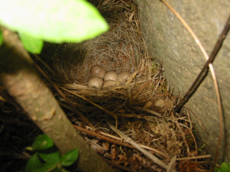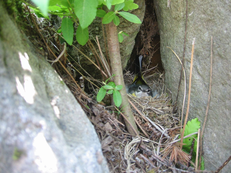 センターの石垣に今年2回目の卵を産みました。最初に卵を産んだ巣には入らずに近くに巣をつくりました。(カラスや野良ネコなどの外敵から身を守るのに適しているようです) キセキレイの行動には色々な特徴がみられます。第一の特徴は、歩いているとき絶えず尾を振っていることです。頭部は動かさず足を軸にして体全体を上下に揺すっています。そのため、長い尾が特に大きく振れてみえるのです。第二の特徴は、鳴きながら波形を描いて飛ぶことです。林の中の水路上を飛ぶ時は「チチッ、チチッ」と少し警戒的な声を発して飛びます。池の面のような開けた上空を飛ぶ時は「チチン、チチン」と響いた声をだし、波形を描いて飛びます。