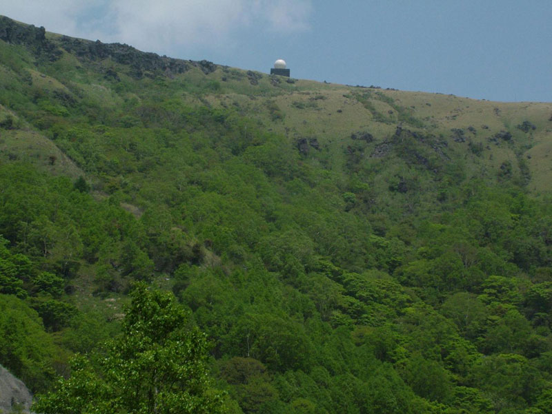 レンゲツツジの花が予想以上に少ない割に、ウィークデーなのに県外車の往来が結構多い。山肌を仰ぐと、富士山頂の測候所に代って設置された無人気象レーダー真下の山の斜面はまだ春の若葉模様でした。その後蛙ッ原(ゲエロッパラ)を池のくるみ方向へ左折した所に、ここも春の影色、辺り一面ゼンマイが林立してまだ葉が開かない状況でした。シャッターを押した直後、この画面を外れたすぐ左側の草むらで突然コウモリガサが「バチン」と音をたてて広がり驚きました。どうやら若いカップルのお邪魔をしてしまったようでした。
