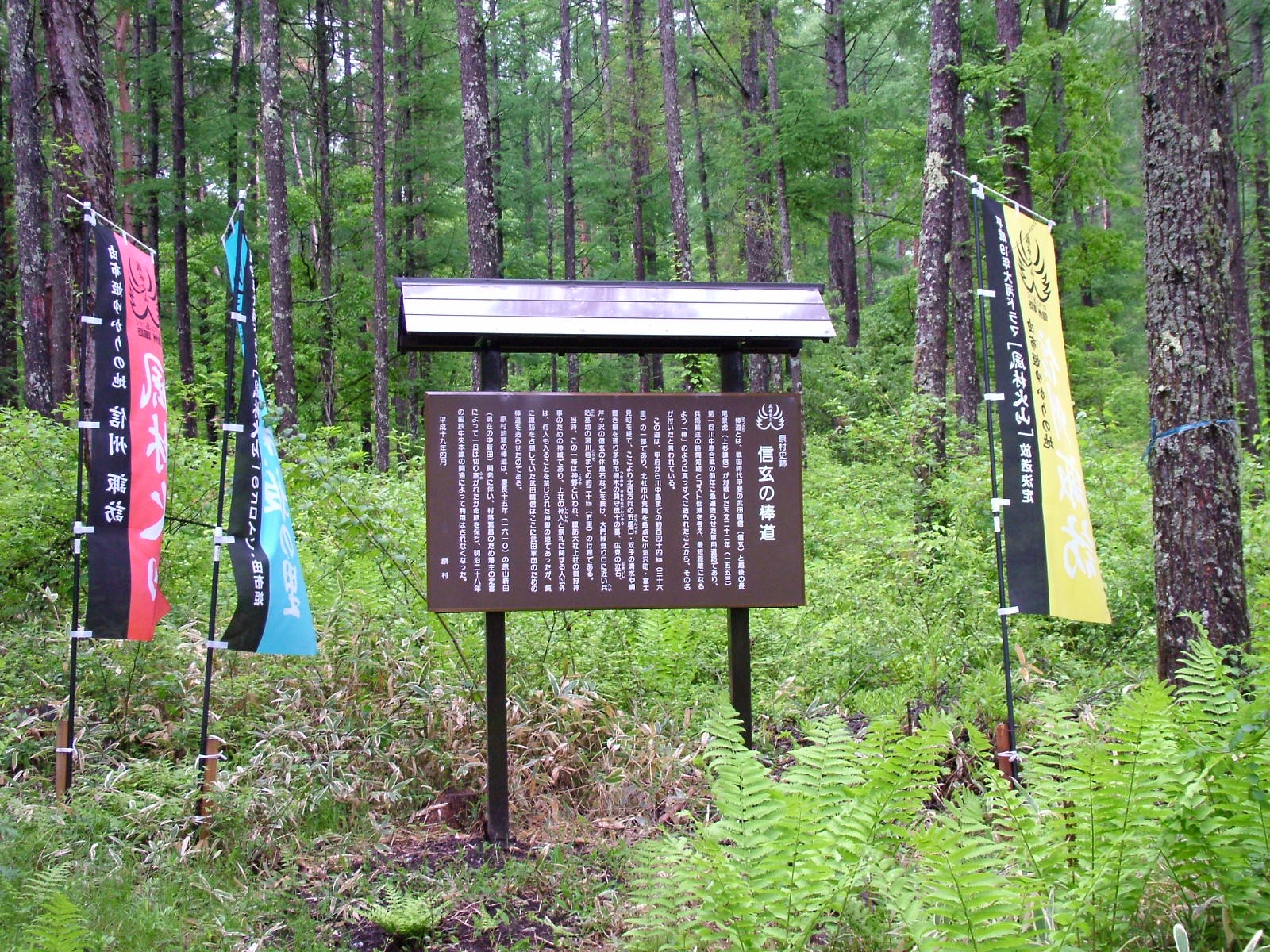 原村史跡 信玄の棒道(看板案内文) 棒道とは、戦国時代甲斐の武田晴信(信玄)と越後の長尾景虎(上杉謙信)が対戦した天文22年(1553)第一回川中島合戦の前年に急遽造らせた軍用道路であり、兵馬輸送の時間短縮とコスト低減を考え、最短距離になるよう「棒」のように真っすぐに造られたことから、その名が付いたと言われている。 この道は甲府から川中島までの約144Km(36里)の一部であり、北杜市小荒間を拠点に小渕沢町・富士見町を経て、ここより北西方向五厘口・双子の清水や綱置き場を通り茅野市槻木(つきのき)の関守伝十の墓、広見の泣き石、芹ヶ沢の信玄の休息石などを抜け、大門峠登り口に近い兵站基地の湯川砦までの約20Km(5里)の行程である。 当時、この一帯は神野といわれ、諏訪大社上社の御狩神事のための神域であり、上社の神人と祭礼に関する人以外は、何人も入ることを禁じられた神聖の地であったが、既に諏訪を占領していた武田晴信はここに武田軍団のための棒道を造らせたものである。 原村地籍の棒道は、慶長15年(1610)の原山新田(現在の中新田)開発に伴い、村落繁昌のため藩主の定書によって一旦は切り塞がれたが命脈を保ち、明治28年の国鉄中央本線の開通によって利用されなくなった。 平成19年 4月 原 村