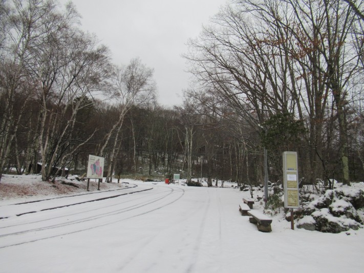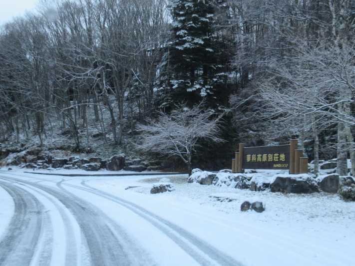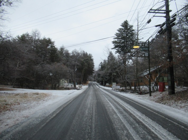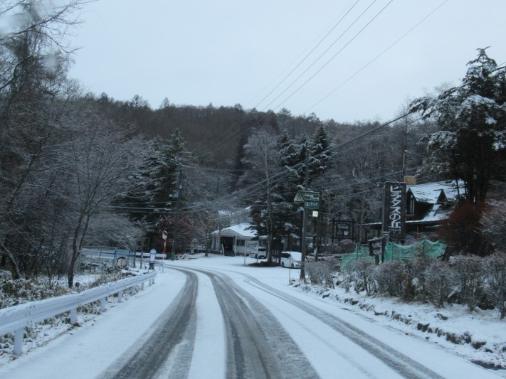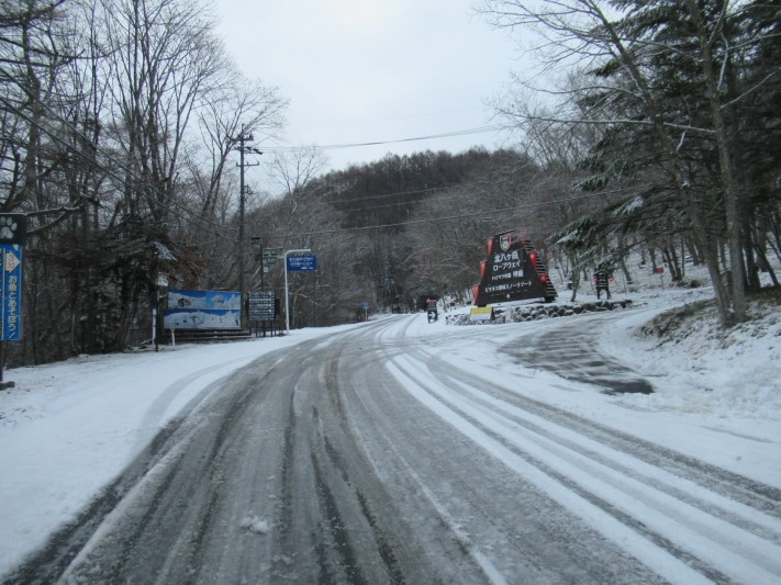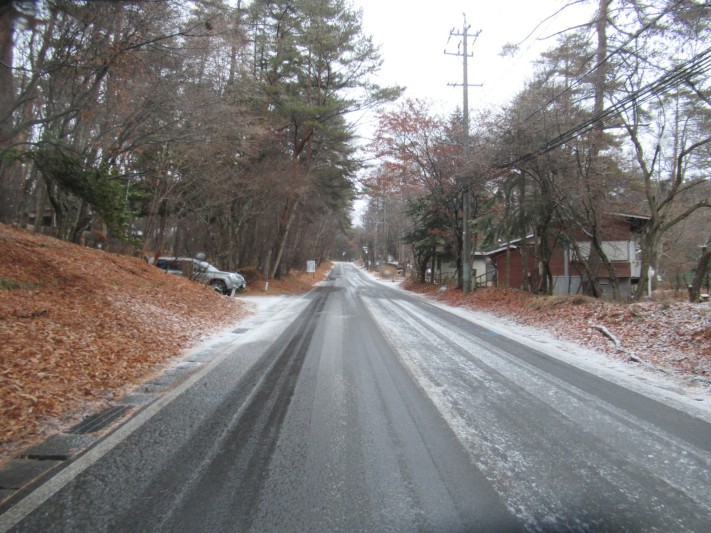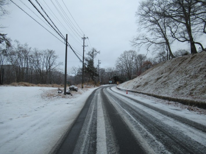 通勤時 新湯入口道路付近は シャーべット状態 登るにつれて 白さを増していきました。
