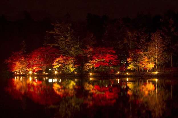 蓼科湖畔では、例年通り紅葉のライトアップが始まりました。