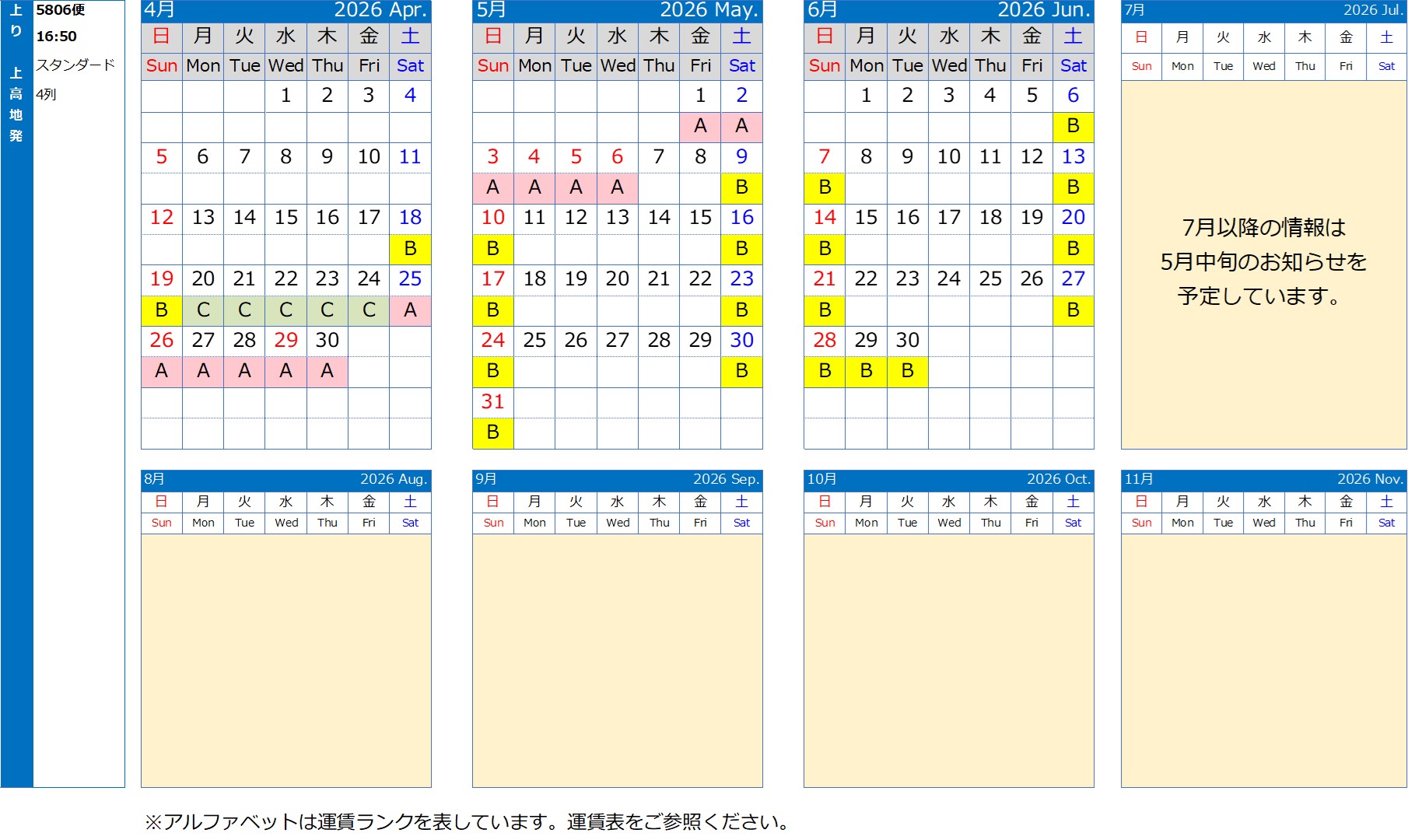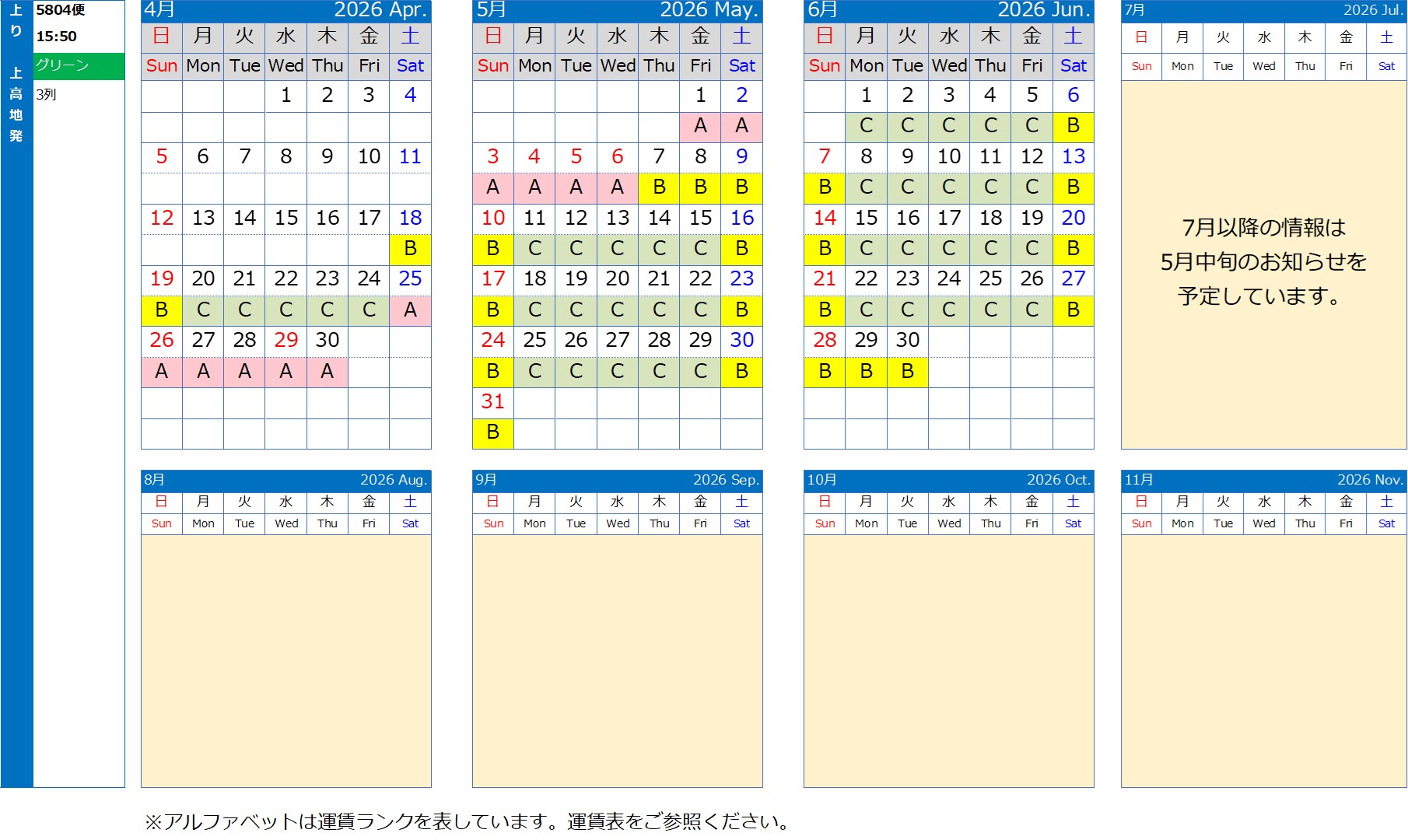 車両故障や点検など、場合によって変更になる可能性もございますのでご了承くださいませ。